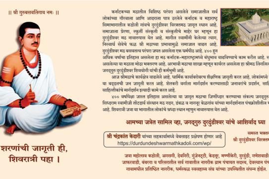 His Holiness Late Sri Duradundeeshwar Shivayogi was a 17th century great saint who established great heritage of devotion. Swamiji dedicated his whole life for betterment of the society. Shivalingeshwar was his first name. He was a Balayogi (Young Monk) who travelled and meditated for several years in the caves of Himalaya. Soon after visited Dhaphalapur of Sangli District as per directives he received during meditation. He was a great yogi who had acquired super natural powers.